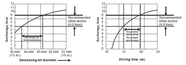 To select the correct drill bit diameter for meeting the recommended initial anchorage of 6 to 9 tons, drill several holes with bit diameters ranging from 1-518 to 1-314 inch (41 to 45 mm).